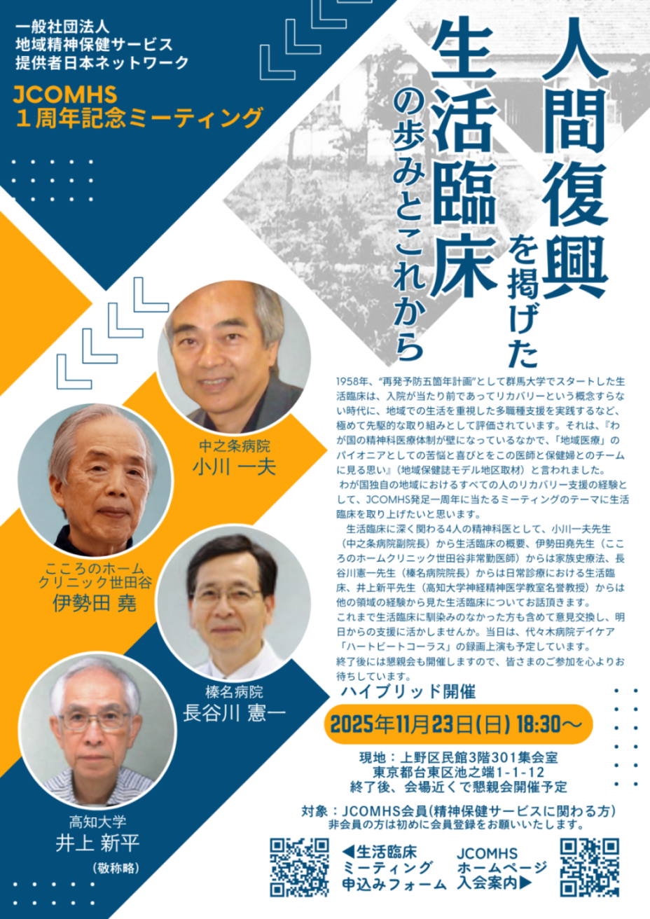 精神保健サービスに携わる方を対象とした会ですが、ご興味のある支援者の方はJCOMHSにご入会の上、ご参加下さい。