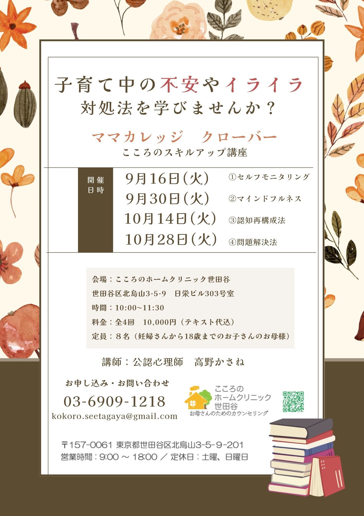 こころのホームクリニック世田谷(電話 03-6909-1218)にお電話頂き、《お母さんのためのカウンセリング》のご希望とお伝えください。当ホームページの問い合わせフォームやメール(kokoro.setagaya@gmail.com)からでも可能です。お名前、生年月日、お子様のご年齢、主なお困り事をお伺いし、ご予約をお取り致します。